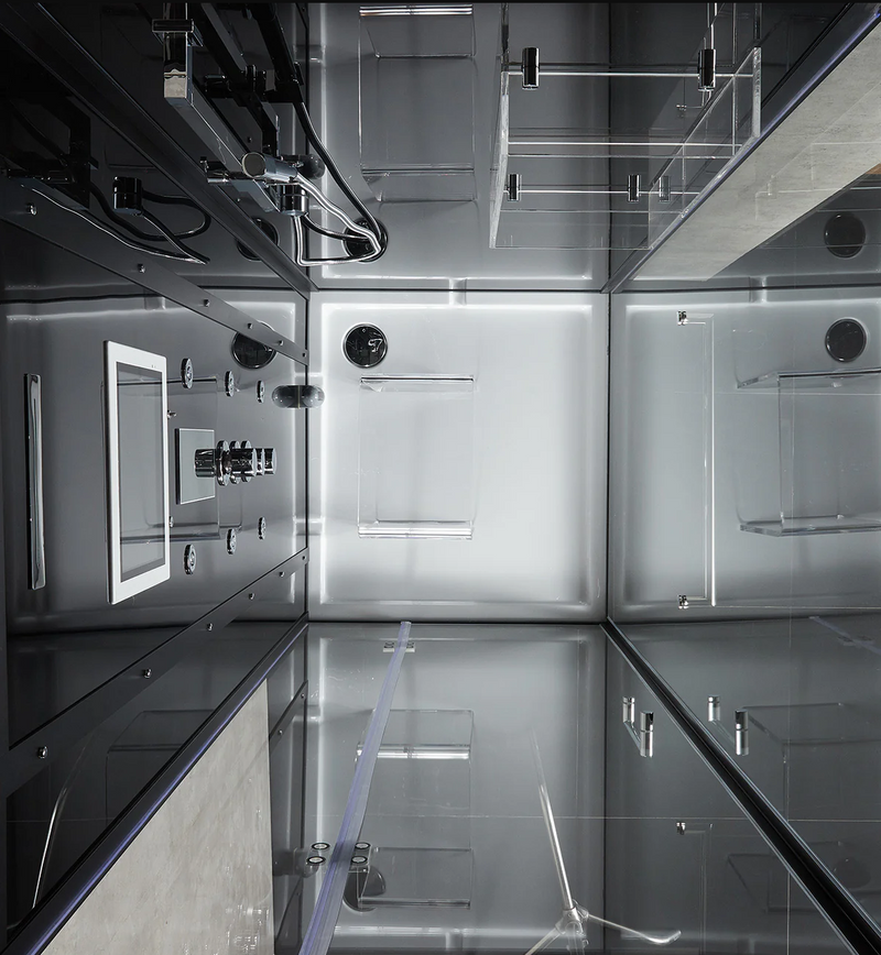 The Platinum Anzio steam shower enclosure is a stunning addition to any bathroom, featuring sleek white or black glass rear paneling and a clear glass front that creates a striking, modern look. This model not only enhances your bathroom's aesthetics but also offers a range of health benefits associated with steam sessions. Equipped with a built-in 12" Android Smart TV Tablet, Bluetooth control panel, overhead spot lighting, and a luxurious rainfall shower, the Maya Bath Platinum Anzio delivers a premium spa experience.